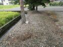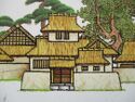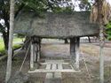 The gate, a wire mesh over its thatching, is situated at the entrance of a small garden. Swampy rice paddies bristle beside it, and a large stone stele overlooks it from the garden. A flowering sarusuberi ("monkey-slip"; crape myrtle) bush and a palm stand beside the gate, complementing the thatching and lending it an almost tropical appeal.